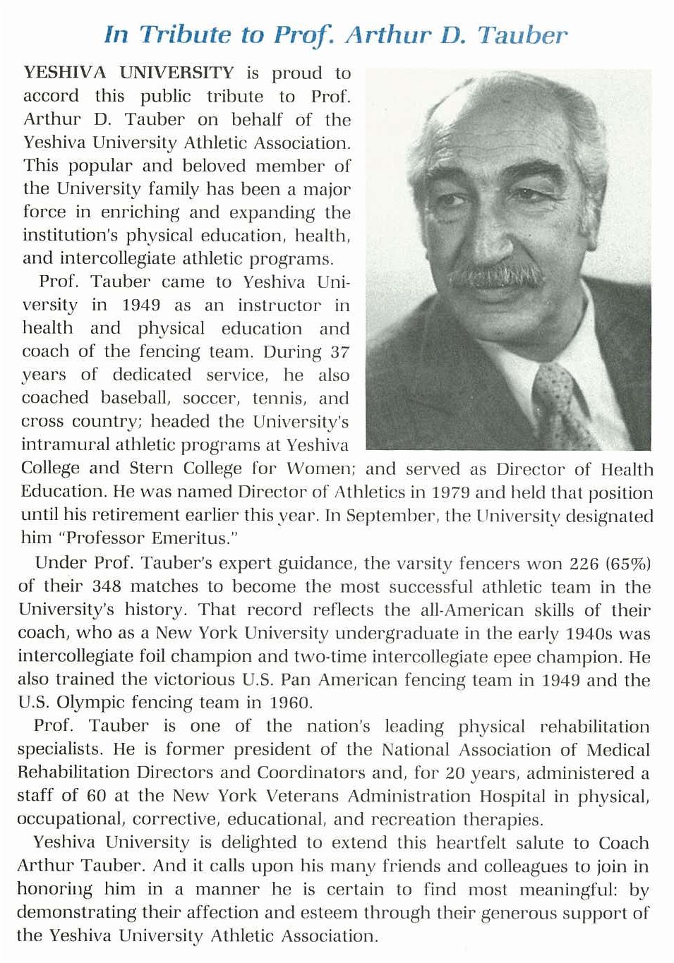 | Yeshiva University held a Centennial Dinner on behalf of the Yeshiva University Athletic Association on Tuesday Nov 11, 1986 at 6 pm at which time one of the honorees was Dr. Arthur Tauber. |
